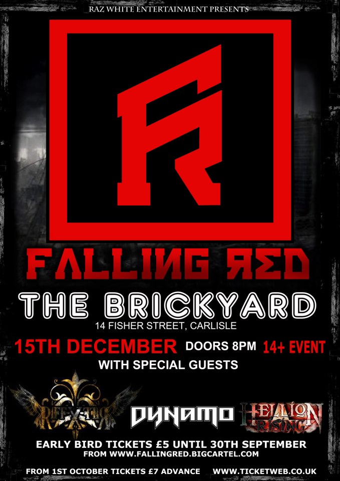 Falling Red back to The Brickyard Posted by Headbangerwoman on August 24, 2012 Posted in: Live Shows, Music, Press Release. Tagged: Brickyard, Carlisle, Falling Red, Raz White Entertainment, UK. Leave a comment Share Headbangerwoman.comTweet Click to email a link to a friend (Opens in new window) Email Click to print (Opens in new window) Print Share on TumblrLike Loading... Related Posts navigation ← No Moshing For Metal Heads Steel workers n sleaze merchants →