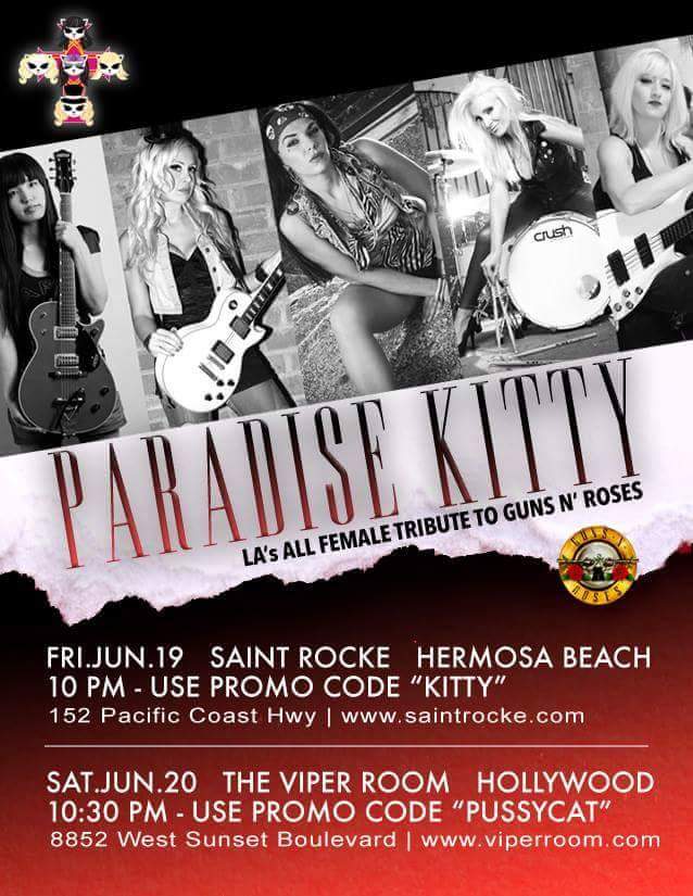 Hey California; Check out Gn’R all girl tribute band Paradise Kitty, on June 19 at Saint Rocke & 20 June at The Viper Room.